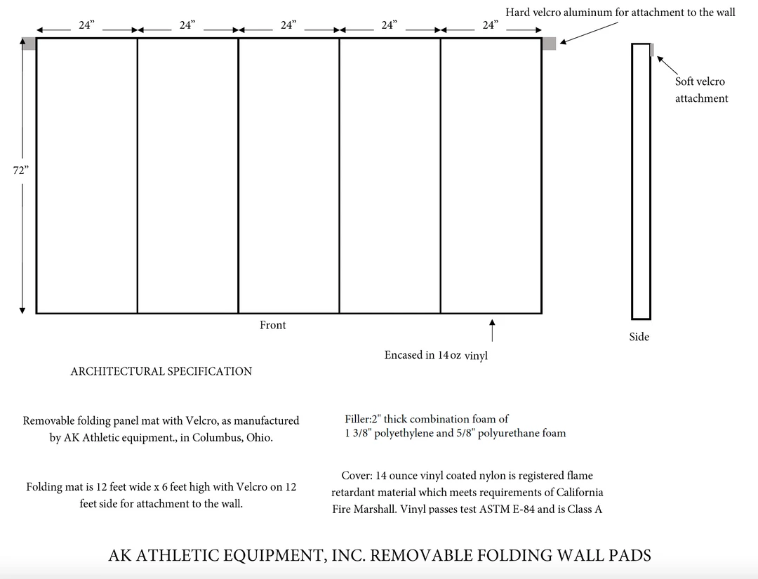 Our 6′ x 12′ x 2″ removable folding wall panel mat is constructed of high quality 14 oz vinyl and 2″ of 3.7 LB polyurethane foam. Each mat comes with a fastening strip and corresponding aluminum that adheres to the desired wall and secures to the matching strip found on the back of the pad. These mats are a great option for under a basketball hoop and provides a safe and shock absorbent protective layer that is 12′ length and 6′ tall. Because the mat is removable it is perfect for anyone that can use it as a floor pad when necessary.
