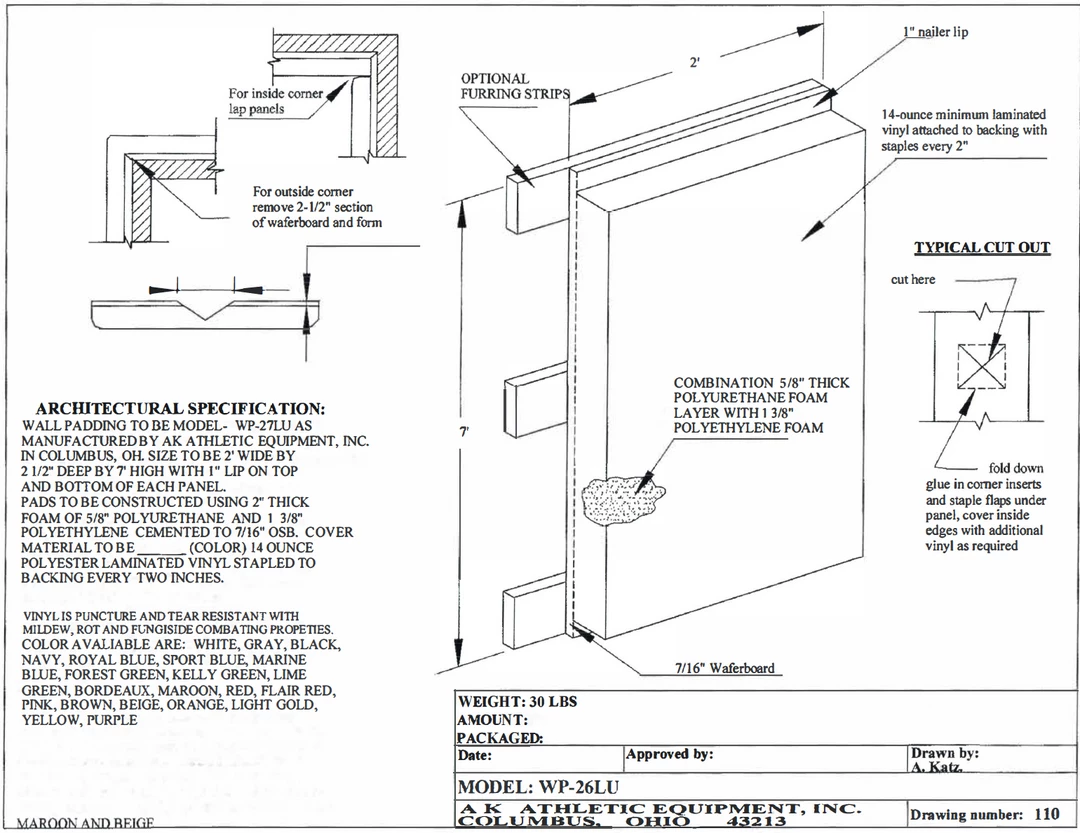 AK Athletics takes pride in tailoring our products to fit perfectly in your space and we provide quotes for custom products at no charge. Our firm 2″ thick foam gym wall pad provides excellent shock absorption for protection even in the most high traffic areas. Cutouts for electrical outlets and custom designed pads are crafted in our factory. 1″ nailer lips at the top and bottom of the pad allow for easy installation, or we have a diy outlet insert to make cut outs on site.