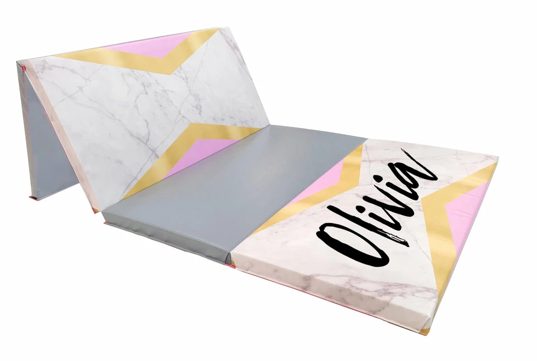 This high quality folding gym mat is 4′ wide and 8′ long with four panels that folds accordion style for easy storage and transportation. Pink and gold folding mat includes fastening strips on two 4′ sides to allow for attachment to other mats. These mats are made from heavy duty 14 oz vinyl that is, lead-free,